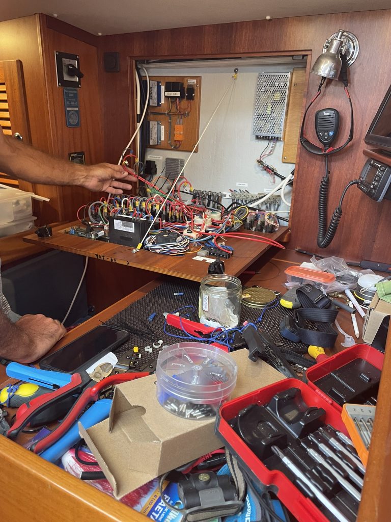 Thomas macht wieder eine neue Baustelle auf und baut dabei wieder das halbe Boot auseinander. Dabei entdeckt Thomas die professionelle, italienische Verdrahtung der Kabel für unseren Plotter. Jetzt wird auch klar, warum der Plotter manchmal ohne erfindlichen Grund ausgegangen ist. Ich vervollständige unseren Blog.
