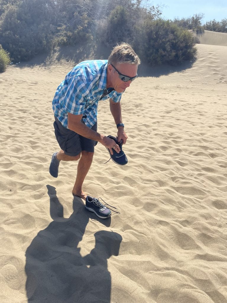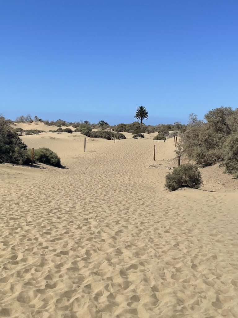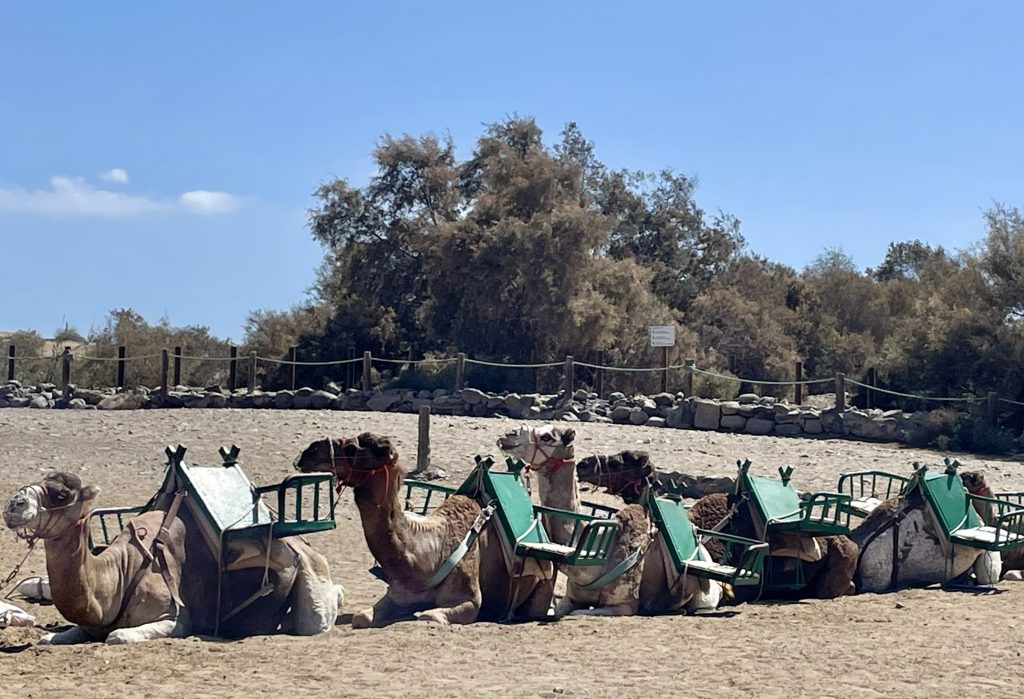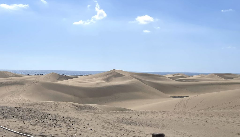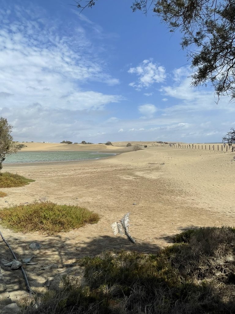 12.10. Dünen von Maspalomas Heute geben wir den Mietwagen bei TopCar in Playa des Ingles ab und gehen wieder zu Fuß nach Pasito Blanco zurück, 9 km! Diesmal nehmen wir den Weg durch die Sanddünen von Maspalomas, hier sind wir fast alleine. Am Ende sehen wir auch noch Kamele und fühlen uns wirklich wie in der Wüste.
