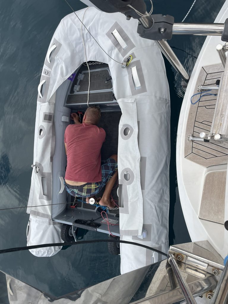 So, jetzt wird es langsam ernst, die Passage auf die Kapverden steht kurz bevor. Wir hatten kurz überlegt, schon heute zu starten, aber wir waren noch so beschäftigt, dass wir diesen Plan ganz schnell aufgegeben haben und es doch bei Sonntag zu belassen. Thomas bereitet das Beiboot vor und legt endlich meine selbst genähtes UV-Schutz-Cover drauf.