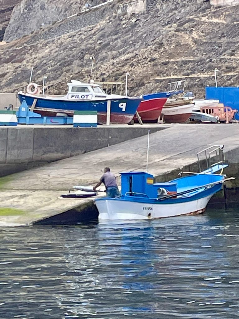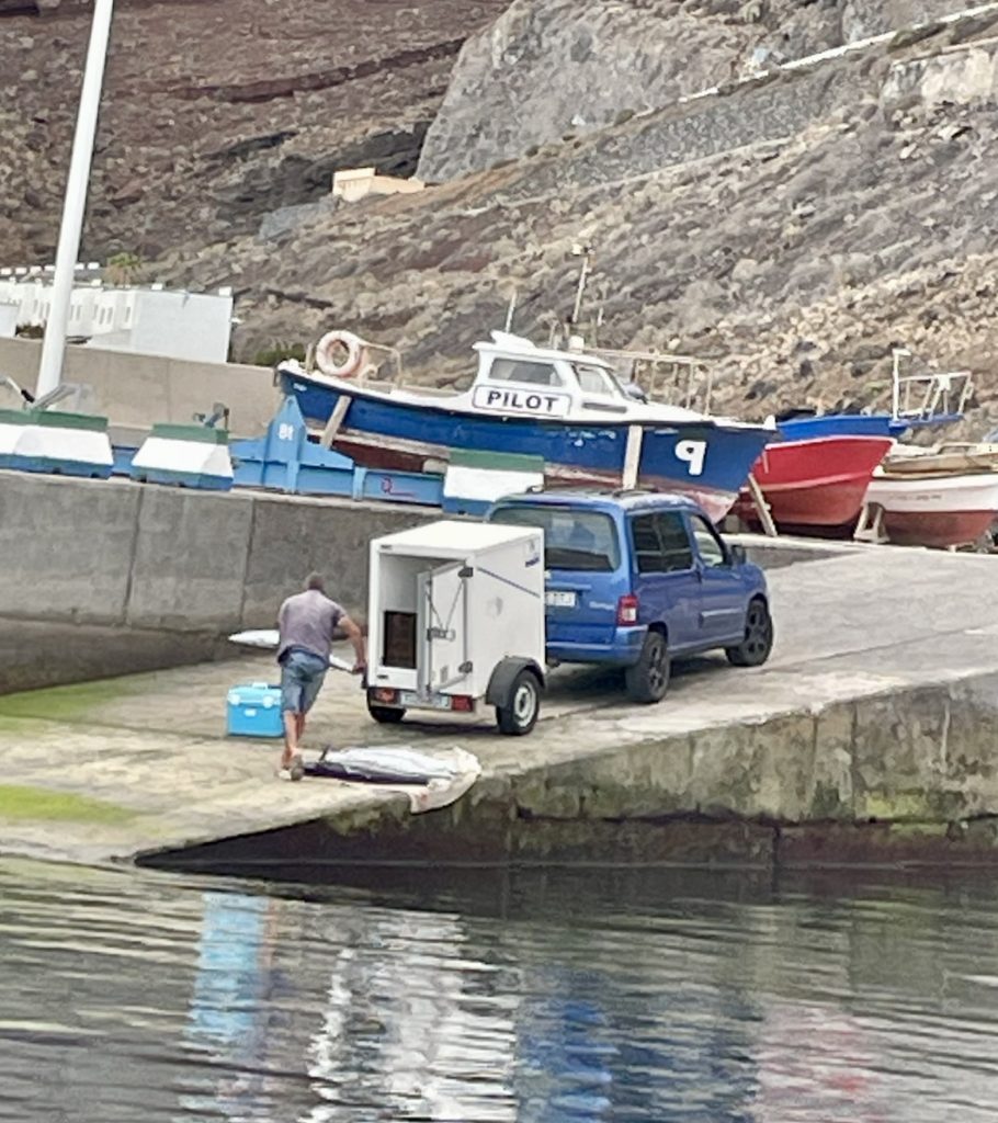 Als wir Pause machen, beobachten wir einen einheimischen Fischer, der 5 große, lange Fische auslädt und mit einem kleinen Kühlanhänger abtransportiert. Thomas kann es nicht fassen und guckt neidisch auf diese Prachtexemplare. Was sind das für Fische? Eine kurze Internetrecherche ergibt, dass es sich um Wahoo’s oder span. Peto’s handeln muss, die hier auf vollkommen handwerkliche Weise gefangen werden. Dazu wird eine Holzattrappe eines Fisches als Lockmittel hinter dem Boot hergezogen wird, um ihn schließlich mit einer langen Angelrute mit einem Köder am Ende zu fangen. Das muss nicht einfach sein, ihn dann an Bord zu hieven. Manche Petos waren so schwer, dass der Fischer ihn kaum aus dem Boot gehoben bekam.