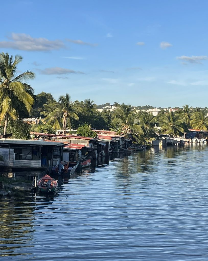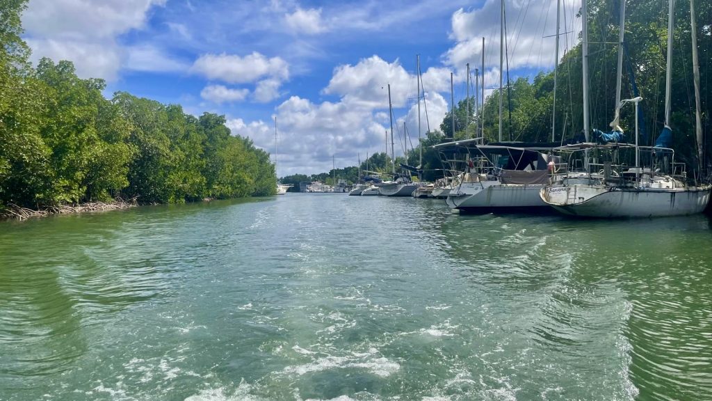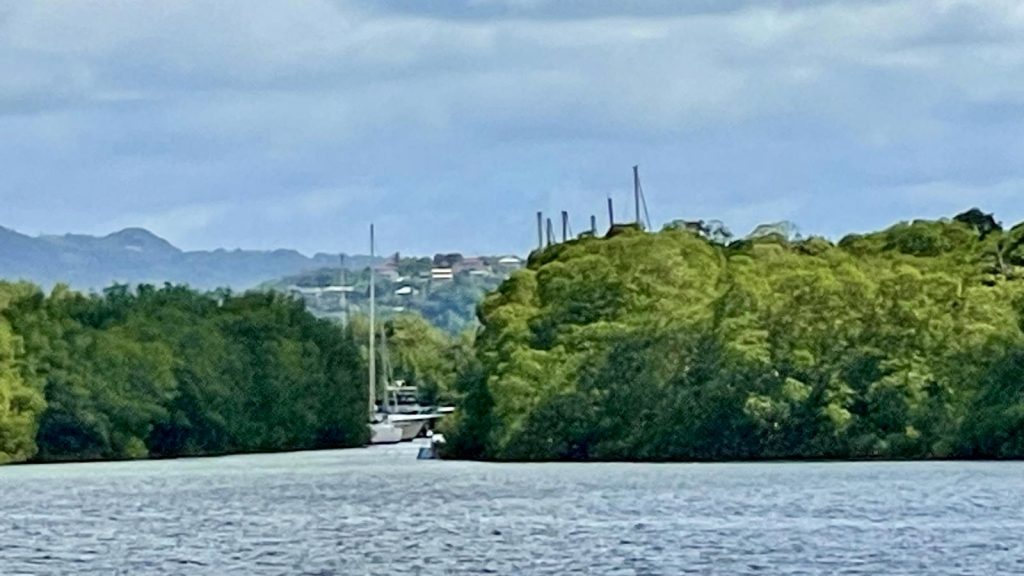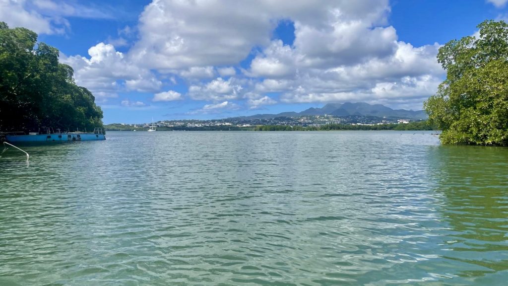 Wir fahren mit dem Dinghi in einen Flussarm, der überwiegend ein Schrottplatz für Boote ist. Wir laufen dann ca. eine halbe Stunde zum Terminal, wo Tjorvi den letzten Platz für einen Flug von Caraïbes Airlines über Guadeloupe nach Paris bekommt . Auch das war wieder ganz schön aufregend.