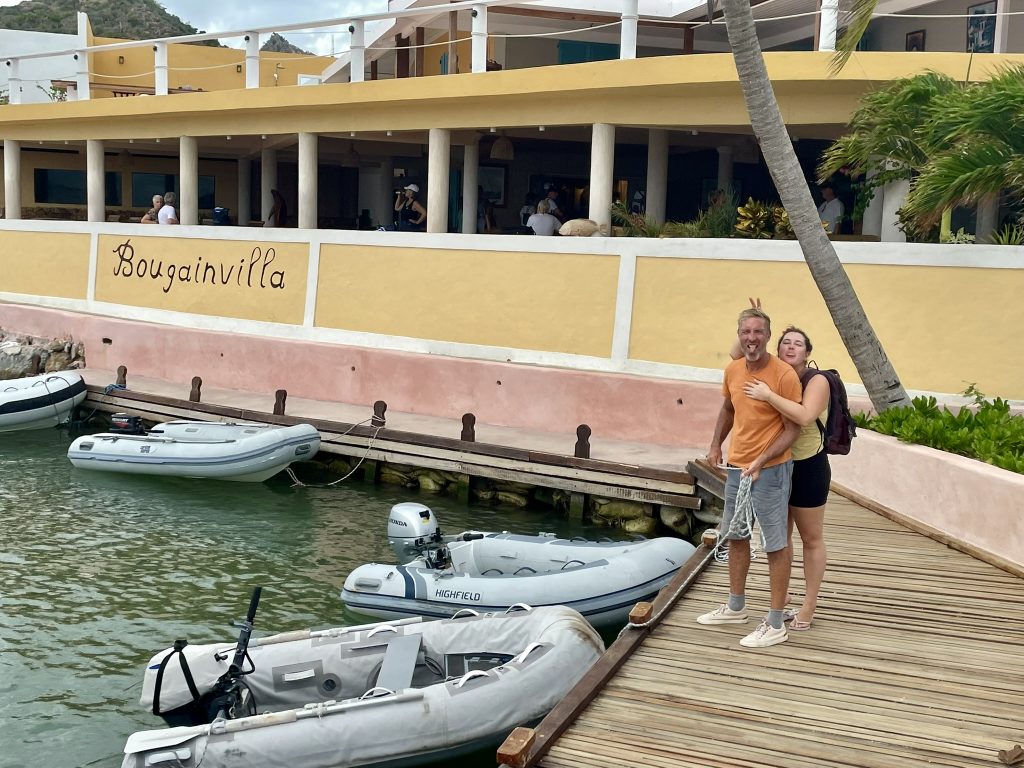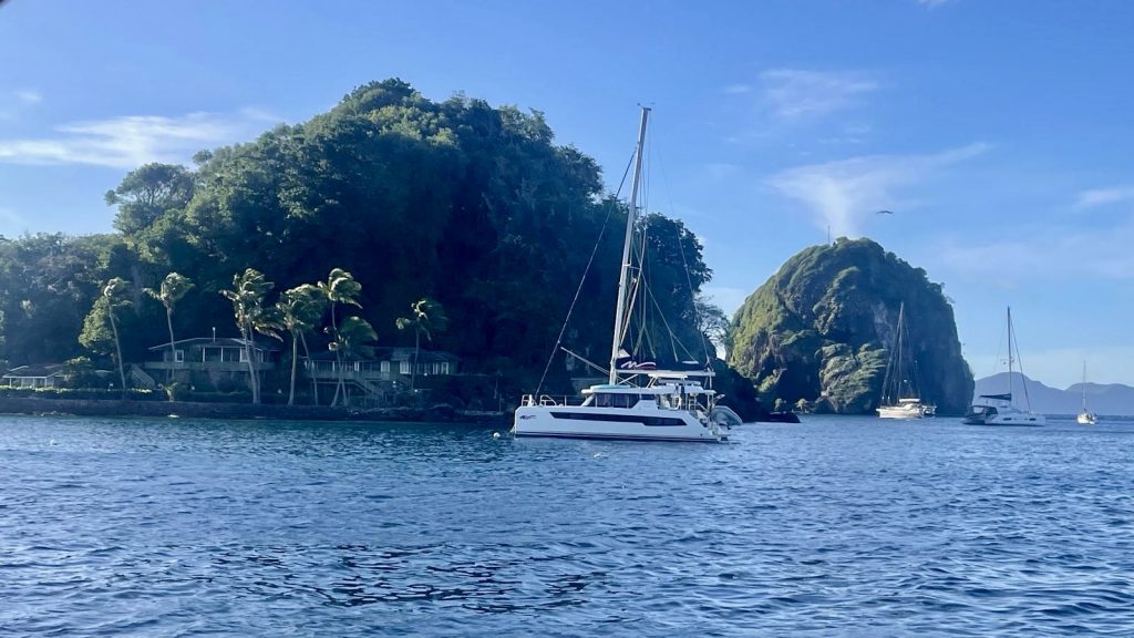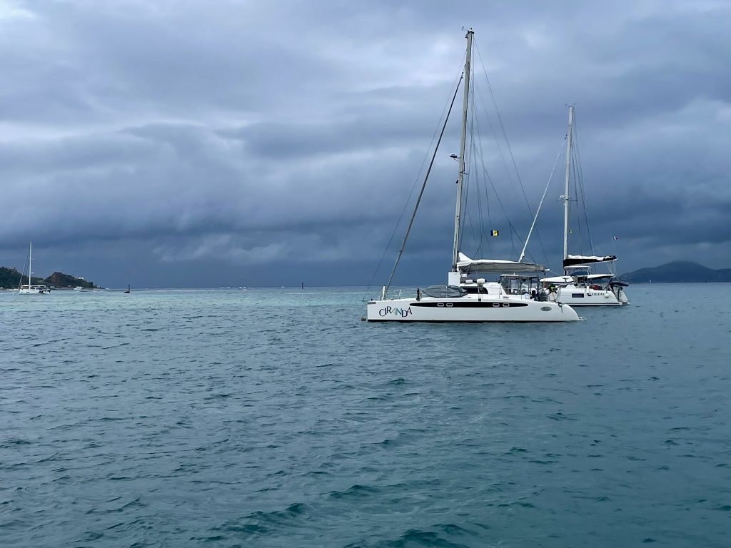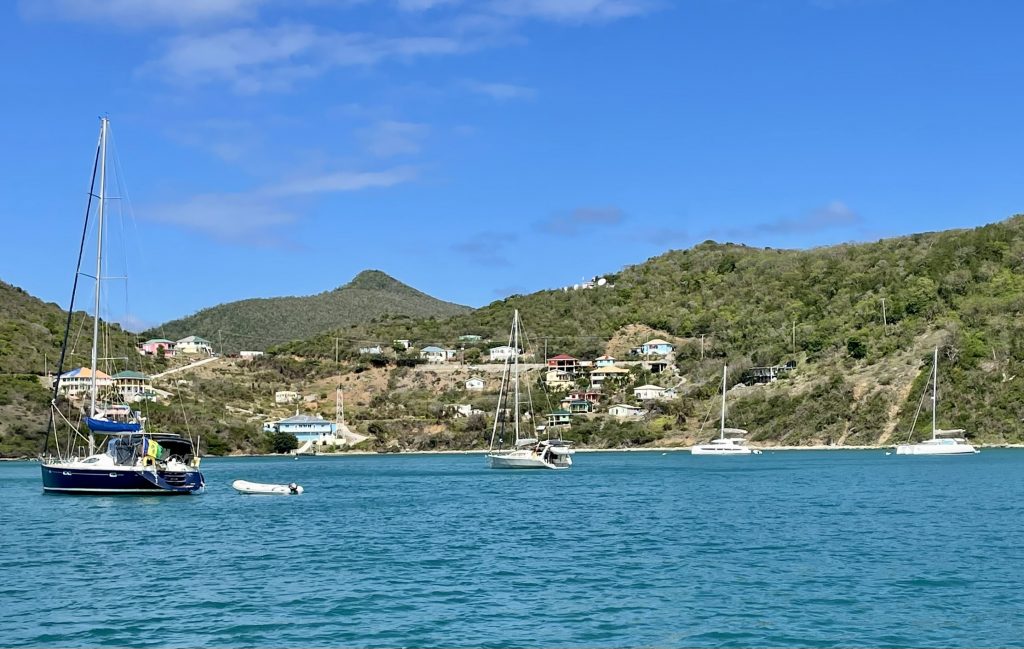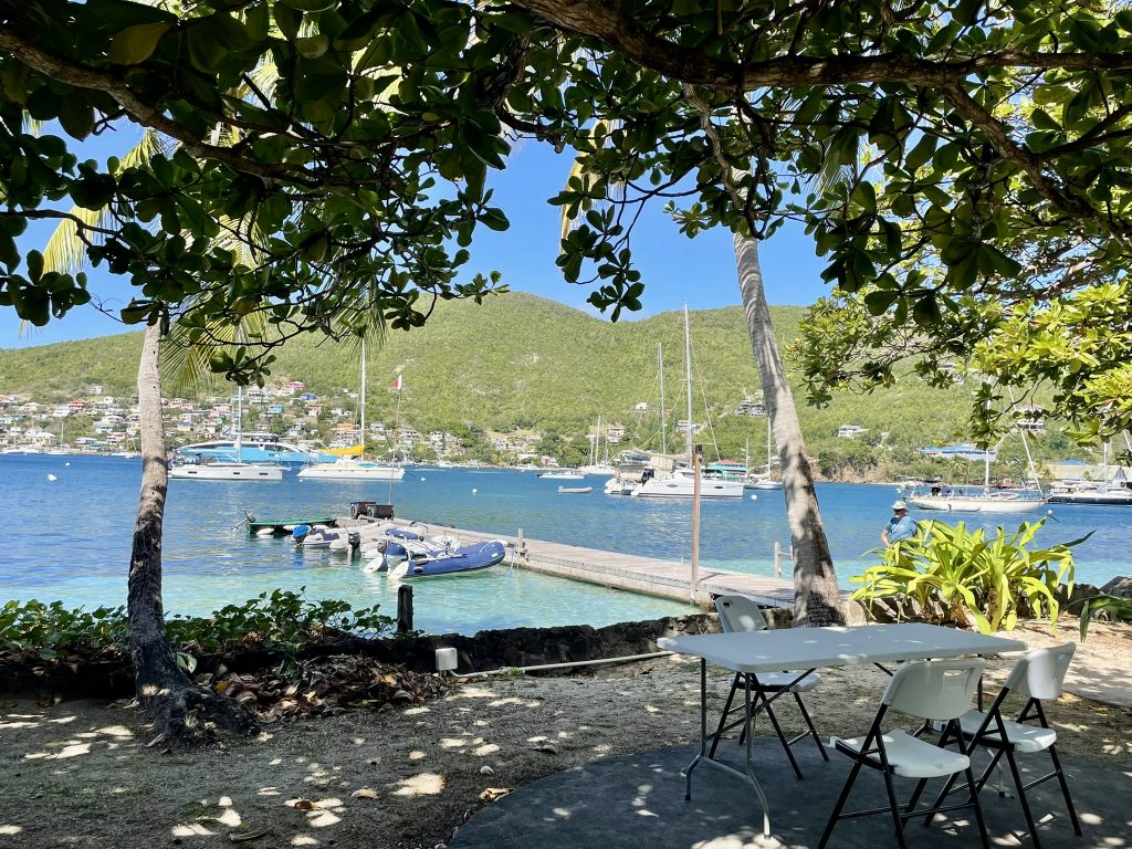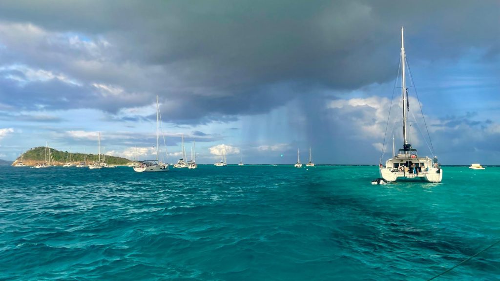 Als wir ankommen, ist tatsächlich noch eine Boje frei, die aber bei über 20kn Wind und Wellen nicht so einfach zu fangen ist. Nach 3 erfolglosen Versuchen, setzt sich ein älteres amerikanisches Paar ins Dinghi, um uns zu helfen und die Leine durch das Auge der Boje zu ziehen. Das ist für die beiden auch nicht komplikationslos, die Leine verheddert sich bei ihnen unter ein Handruder. Sie können es aber lösen – puuuh geschafft
